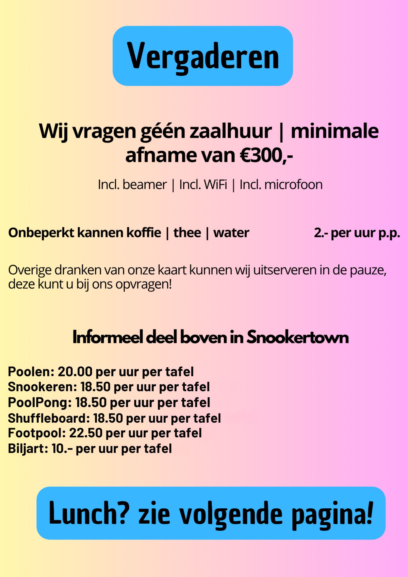 Wij vragen geen zaalhuur bij een afname van minimaal €300